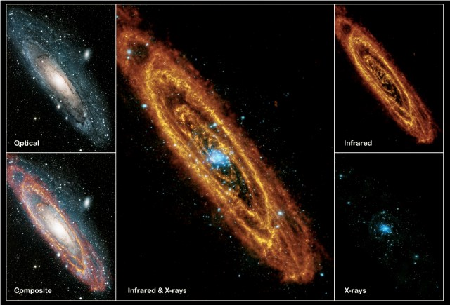 Slikajući našu najbližu galaksiju Andromedu viđena su područija rađanja i umiranje zvezda onako kako ih ljudsko oko ne može videti. Veliki prstenovi prašine, u kojima se rađaju nove zvezde, verovatno vode poreklo od sudara Andromede sa nekom manjom galaksijom viđeno u infracrvenom spektru i umiruće zvezde viđene u X spektru koncentrisane većim delom oko centra Andromede.