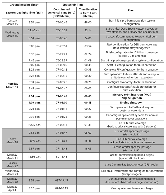 Noćašnje paljenje motora i manevar u trajanju od 15 minuta je proteklo bez problema i za sada sve funkcioniše u kako bi trebalo, s obzirom na blizinu Sunca i visokih temperatura koje vladaju u takvom okruženju, a cilj ovog manevra i potrošene trećine goriva je korekcija putanje letelice za ulazak u Merkurovu orbitu. Međutim, letelica i instrumenti na njoj su naravno pripremljeni za takve ekstremne uslove. Instrumenti će biti provereni 24. marta, dok će 4. aprila MESSENGER početi sa slanjem prvih naučnih podataka na Zemlju. Predviđeno trajanje misije iznosi jednu godinu.