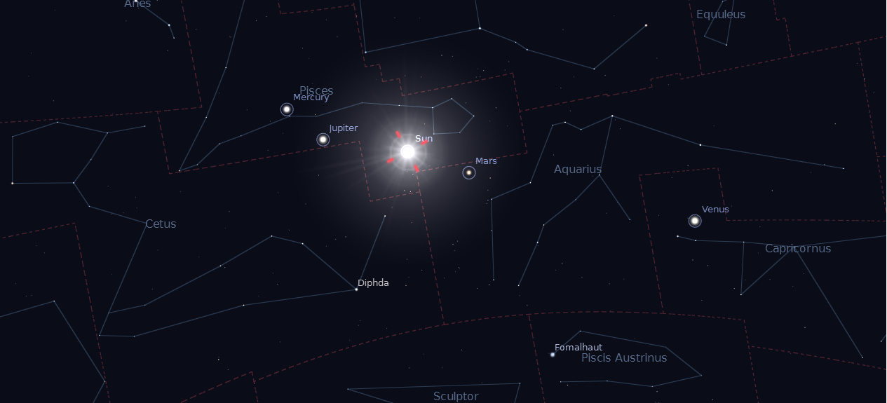 U istom trenutku i Jupiter i Merkur će se nalaziti u sazvežđu Ribe, dok će Mars biti u Vodoliji a Venera u Jarcu. Naravno, ovo nema veze sa astrologijom već će se jednostavno tu zateći planete u trenutku početka proleća. I naravno da to neće imati nikakav uticaj na bolove u kolenima i aritmiju. 😉