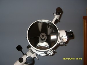 Samo postavljanje opreme je trajalo nekih 10 do 15 minuta. Za ovu vrstu teleskopa sasvim dovoljno vreme za hlađenje, što se tiče posmatranja. Od opreme korišćeno je: tražioc 6×30, okulari od 10 i 25 mm, kao sočivo barlow 2X. I naravno teleskop Skywatcher 150/750 na ekvatorijalnoj montaži (EQ3).