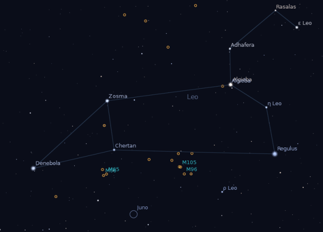 U sazveđu Lav odmah ispod zvezde Chertan mogu se naći dve galaksije M65 i M66. Ako pratimo paralelno zamišljenu liniju koja spaja ovu zvezde i najsjajniju zvezdu u Lavu, Regulus, naićićemo na još dve galaksije M95 i blizu nje M96, kao i galaksiju M105. Ispod ovih galaksija na slici se vidi i planetoid Juno.