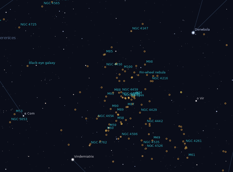 Kao što se vidi sa slike u ovom jatu se nalazi gomila Mesijeovih (M) objekata. Jedinstveno mesto na nebu gde se na “malom” prostoru može uživati u posmatranju velokog broja galaksija. Gore desno se vidi druga zvezda po sjaju u Lavu, dole zvezda Vindemiatrix u Devici i gore desno se nalazi sazvežđe Berenikina kosa.