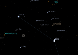 Ova galaksija se nalazi u sazvežđu Lovački psi i to blizu same granice sa sazvežđem Veliki Medved u blizini zvezde Alkaid, koja se nalazi na početki poznatog dela Velikog Medveda – Velikih Kola.