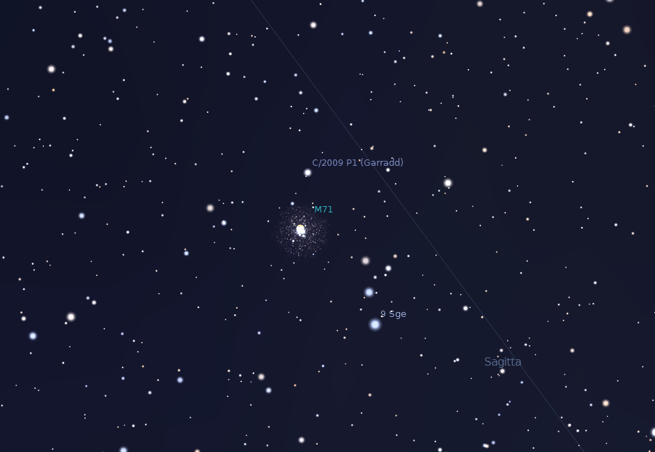 Ovih dana na noćnom nebu je moguće posmatrati kometu Gerrard (službeno C1/2009 P1 Gerrard). Prošla je pored zbijenog zvezdanog jata blizu zvezde Enif u Pegazu, zatim preko sazvežđa Delfin da bi večeras stigla u sazvežđe Strelica odmah pored zvezdanog jata M71.