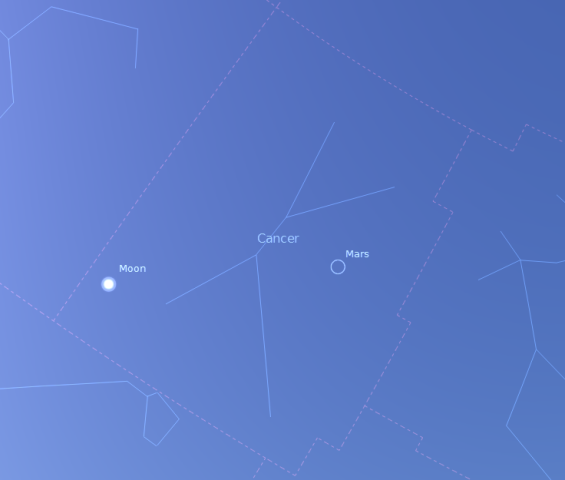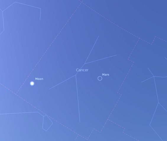 Mesec će se tada nalaziti u sazvežđu Rak (Cancer), a zajedno sa njim i planeta Mars.