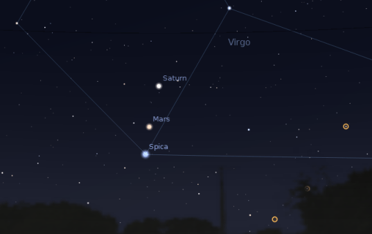 Do polovine avgusta Saturn će malo promeniti položaj u odnosu na Spiku, ali će mu se pridružiti i planeta Mars i biti izmenju njega i Spike. Tih dana će im i Mesec na kratko praviti društvo, tako da će Saturn, Mars, Spika i Mesec biti prividno blizu na nebu u sazvežđu Devica. Ovaj susret će biti vidljiv odmah nakon zalaska Sunca, ali ovaj put na zapadnom nebu.