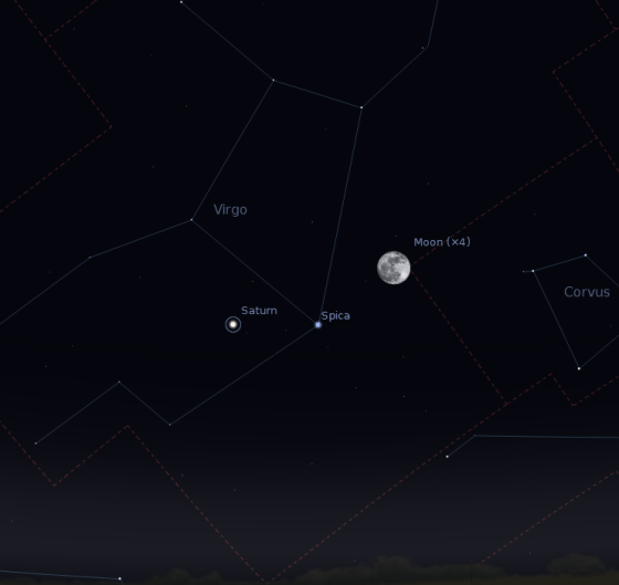 Baš te večeri će Mesec biti u fazi punog meseca (tabela na dnu teksta) što će znatno umanjiti sjaj Saturna i Spike. Saturn će biti magnitude 0,81 i udaljen od Zemlje 8,73188 AJ (astronomska jedinica – srednje rastojanje Zemlja – Sunce), dok će Spika biti magnitude 0,95. Spika je udaljena od nas 262 svetlosne godine.