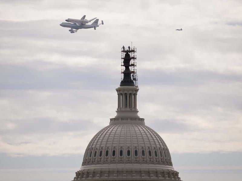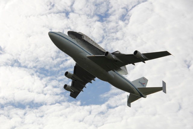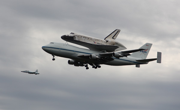 Šatl je postavljen na modifikovani avion (Boeing 747 Jumbo Jet) koji je leteo nisko sa namerom da što više ljudi posmatra ovaj poslednji let.