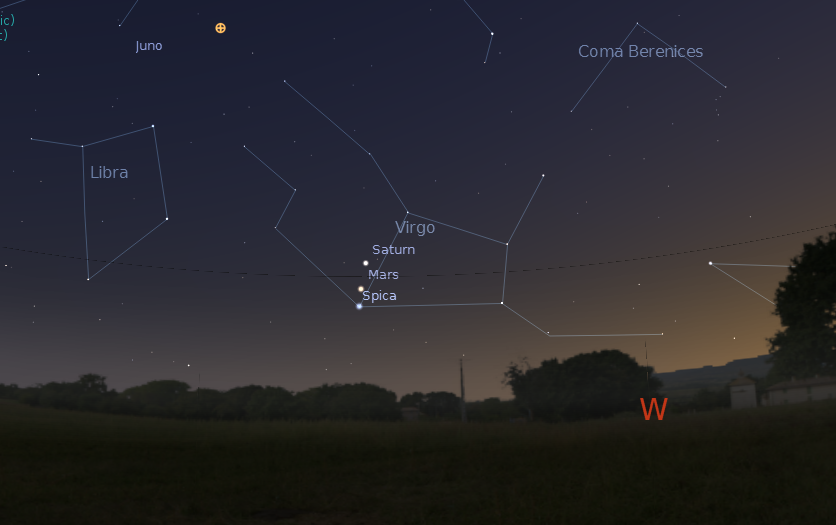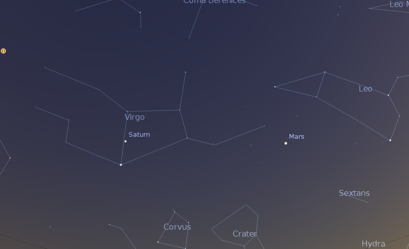 Mars, koji se još uvek nalazi u sazvežđu Lav, lagano se približava Saturnu. Saturn se nalazi u sazvežđu Devica odmah iznad Spike, najsjajnije zvezde u ovom sazvežđu.