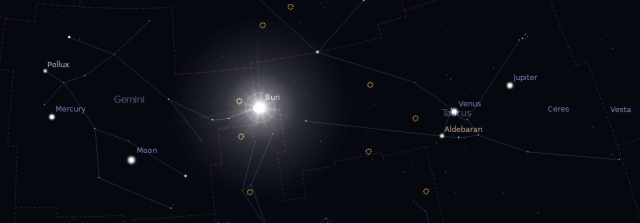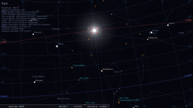U trenutku početka leta ove godine, Sunce će se nalaziti u sazvežđu Bik, na samoj granici sa sazvežđem Blizanci gde će se naći već narednog dana. U sazvežđu Bik Suncu će društvo praviti Jupiter i Venera, dok će Mesec zajedno sa Merkurom biti u sazvežđu Blizanci. I onako usput…tu negde će biti i planetoid Ceres i astreroid Vesta. Sve ovo je na sledećoj slici preuzetoj iz Stellarium-a: