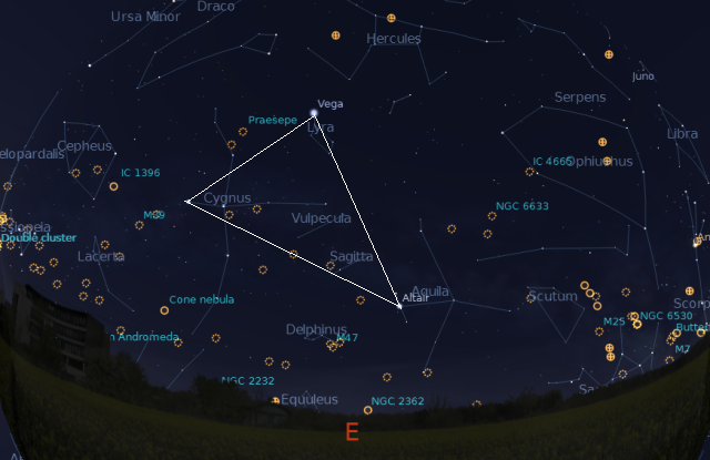 Ovih dana, oko 21:30, položaj Velikog letnjeg trougla u odnosu na istočni horizont izgleda ovako: