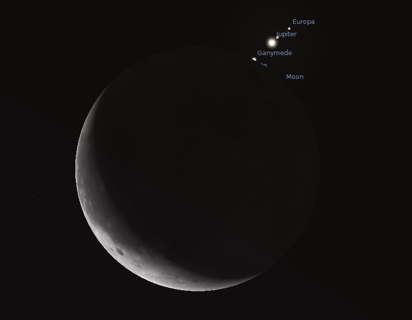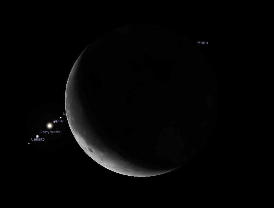 Ovako će izgledati Mesec i položaj Jupitera i njegovih satelita nekoliko trenutaka pre početka okultacije: