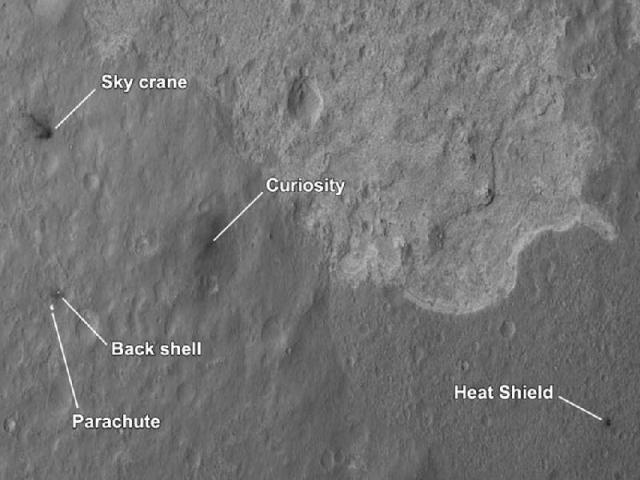 Stigle su i slike sa NASA-inog orbitera (Mars Reconnaissance Orbiter (MRO)) koji kruži oko Marsa. Na fotografijama se vidi mesto gde je rover Curiosity sleteo, kao i mesta ostalih delova kao što u sky crane, padobran i pozadinska školjka kapsule i toplotni štit.
