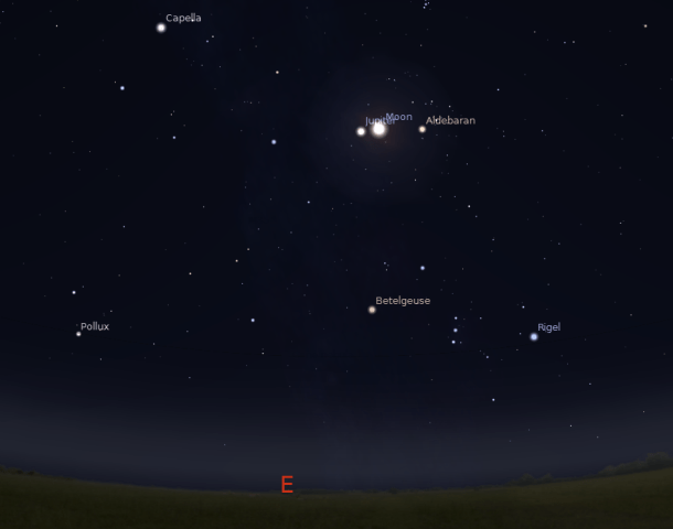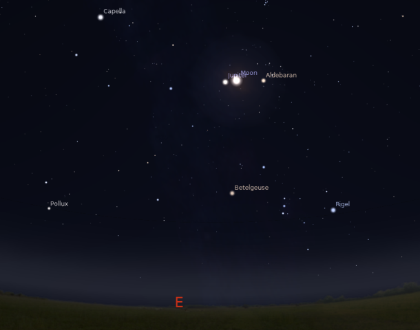Položaj nebeskih tela je onakav kakav će biti večeras oko 22h. Ispod Jupitera i Meseca je sazvežđe Orion sa zvezdom, crvenim džinom Betelgezom. Dole levo je zvezda Prokion u sazvežđu Mali Pas, dok je gore levo sjajna zvezda Capella u sazvežđu Kočijaš. Odmah pored Meseca je i zvezda Aldebarin u sazvežđu Bik, kao i nezaobilazne Plejade iznad ove zvezde.