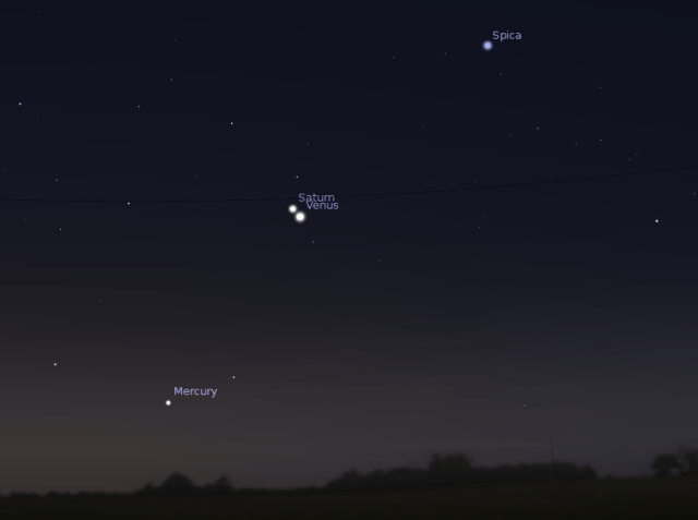 Dok će se ispod Saturna i Venere nalaziti Merkur, iznad će se nalaziti najsjajnija zvezda u sazvežđu Devica – Spika. Ova 4 nebeska tela će dominirati tog jutra na istočnom nebu.