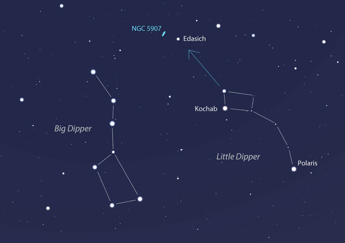 Galaksija je prividno udaljena od zvezde Edasich svega 3 stepena. Ovaj sudar ne može se videti običnim teleskopima, već samo na astrofotografijama sa dugim ekspozicijama i boljim teleskopima kao recimo ovaj na Blackbird Observatory.