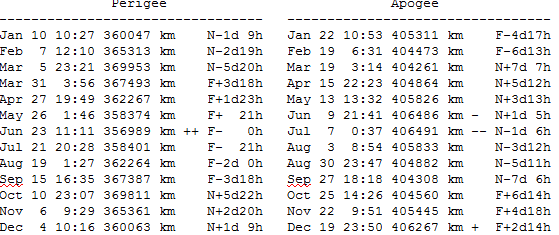 Kada je Mesec (ili bilo koje drugo nebesko telo) najbliži Zemlji kažemo da je u perigeju, a kada je najudaljeniji kažemo da je u apogeju. Dok Mesec napravi jedan krug oko Sunca prođe kroz jedan perigej i jedan apogej. U sledećoj tabeli možete pogledati najmanje i najveće udaljenosti Meseca za 2013. godinu.