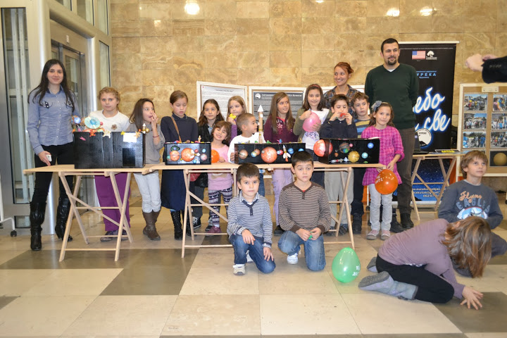 U Astro kutku prisustvovali smo predavanju Janka Mravika i Jaroslava Grnje o radu AD “Univerzum” ali i njihove robotizovane opservatorije “Nigh Hawk”, kao primer dobre prakse šta se sa puno rada i volje može napraviti. Reč je o prvoj robotizovanoj opservatoriji u Srbiji koju su napravili astronomi amateri i koja je vodeća astronomska stanica za posmatranje i detekciju ekstrasolarnih planeta, dvojnih zvezda i asteroida. U gornjem delu prisustvovali smo radionici gde su mališani pravili od stiropora i bojci modele Sunčevog sistema i promociji knjige ASTRONOMIJA autora Nikole Božića, koji je januara 2013. godine posetio naš grad.