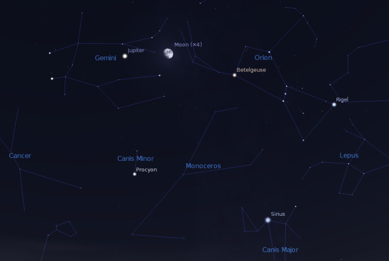 Jupiter i Mesec će se večeras prividno približiti jedno drugom i zajedno sa zvezdama Betelgez, Siriju, Rigel, Kastor, Poluks i Prokion omogućiti zanimljivo posmatranje noćnog neba.