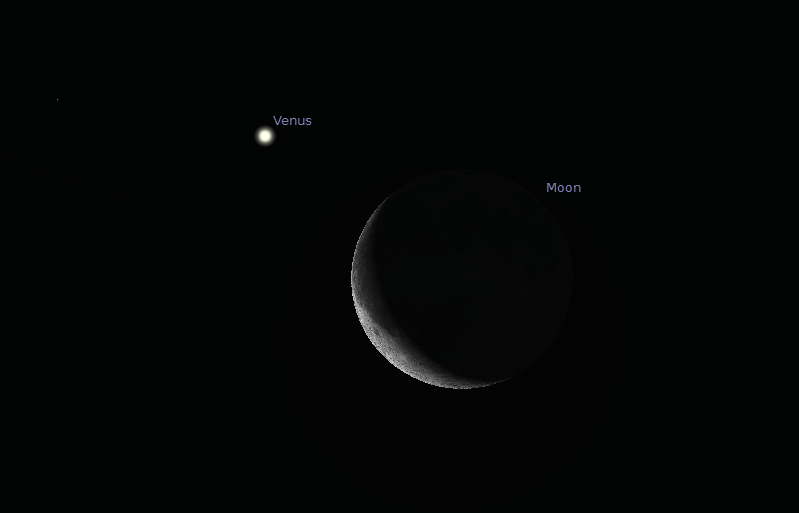 Nažalost, iz naših krajeva moći ćemo da posmatramo samo konjukciju ova dva nebeska tela koja će prividno biti udaljena jedno od drugog svega oko pola stepena. Mesec je u opadanju i videće se samo njegov srp što će olakšati posmatranje Venerinog sjaja koji će biti sa magnitudom od 4.3.
