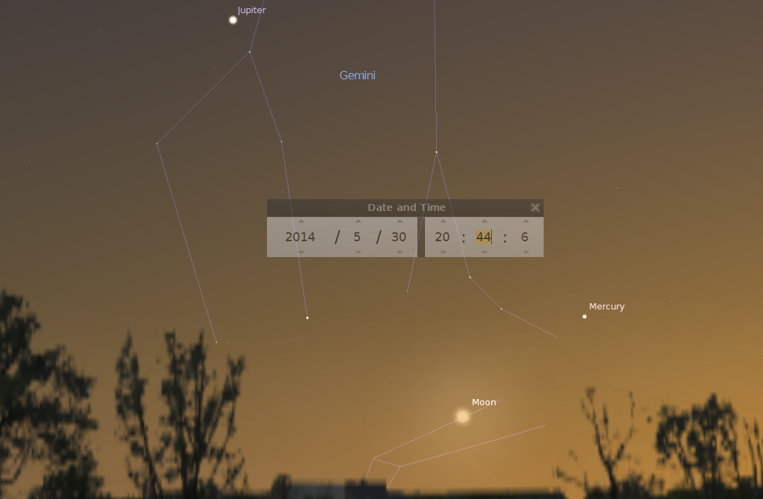 Jupiter i Merkur će se nalaziti u sazvežđu Blizanci, dok će se Mesec nalaziti u sazvežđu Orion koje je sada sa zalaskom Sunca većinom ispod horizonta i nećemo ga moći posmatrati narednih nekoliko meseci.