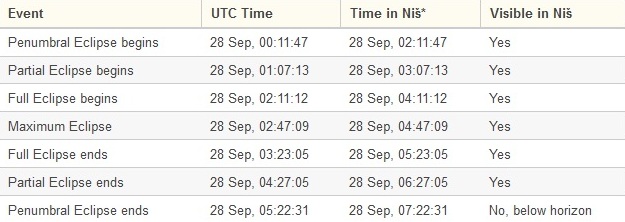 U sledećoj tabeli su data bitna vremena tokom pomračenja Meseca od ulaska u zemljinu senku do izlaska iz nje.