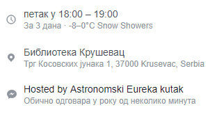 Povodom 100 godina od osnivanja Međunarodne astronomske unije i povodom projekta “100 sati astronomije” astronomsko udruženje “Eureka” i Narodna biblioteka Kruševac organizuju predavanje pod nazivom “Amaterska astronomija u godini jubileja”. Cilj predavanja jeste da se ljubitelji astronomije upoznaju sa organizacijom Međunarodne astronomske unije, čime se ona bavi, kako je osnovana i gde je u celoj priči razvoja astronomije amaterska astronomija. Na predavanju biće prikazani primeri uspešnih astronoma amatera koji su dali značajan doprinos razvoju astronomije, ali i predstavljeni projekti koje će Eureka sa svojim partnerima širom Srbije realizovati u 2019 godini. Predavač je predsednik udruženja Zoran Tomić. Predavanje će biti prenošeno putem lajv prenosa na fejsbuku tako da će ljubitelji astronomije i van sale biblioteke moći da čuju ovo predavanje.