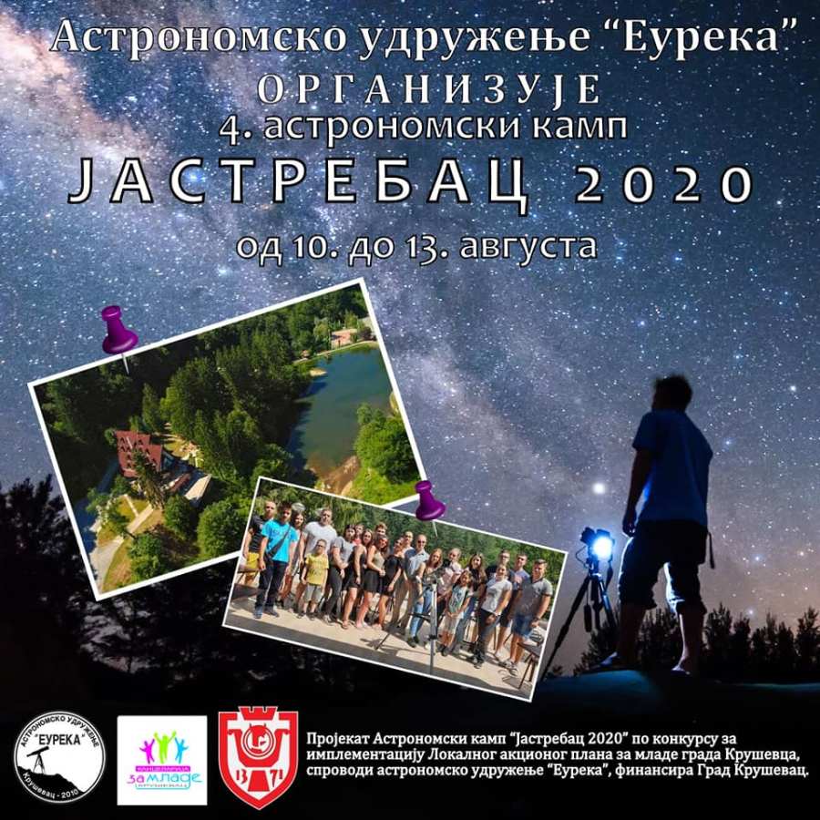 Projekat astronomski kamp “Jastrebac 2020” po konkursu za implementaciju Lokalnog akcionog plana za mlade grada Kruševca, realizuje astronomsko udruženje “Eureka, koje finansira Grad Kruševac u saradnji sa Kancelarijom za mlade grada Kruševca, Turističkom organizacijom grada Kruševca i Centrom za stručno usavršavanje Kruševac.