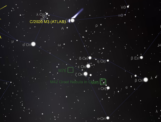 Slika na vrhu: Kometa ATLAS (C/2020 M3) snimljena 7. novembra iz Austrije. Na desnoj strani slike je maglima M42 u sazvežđu Orion koja je vidljiva golim okom.