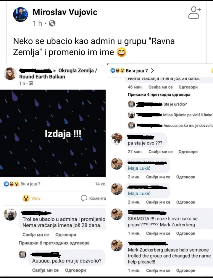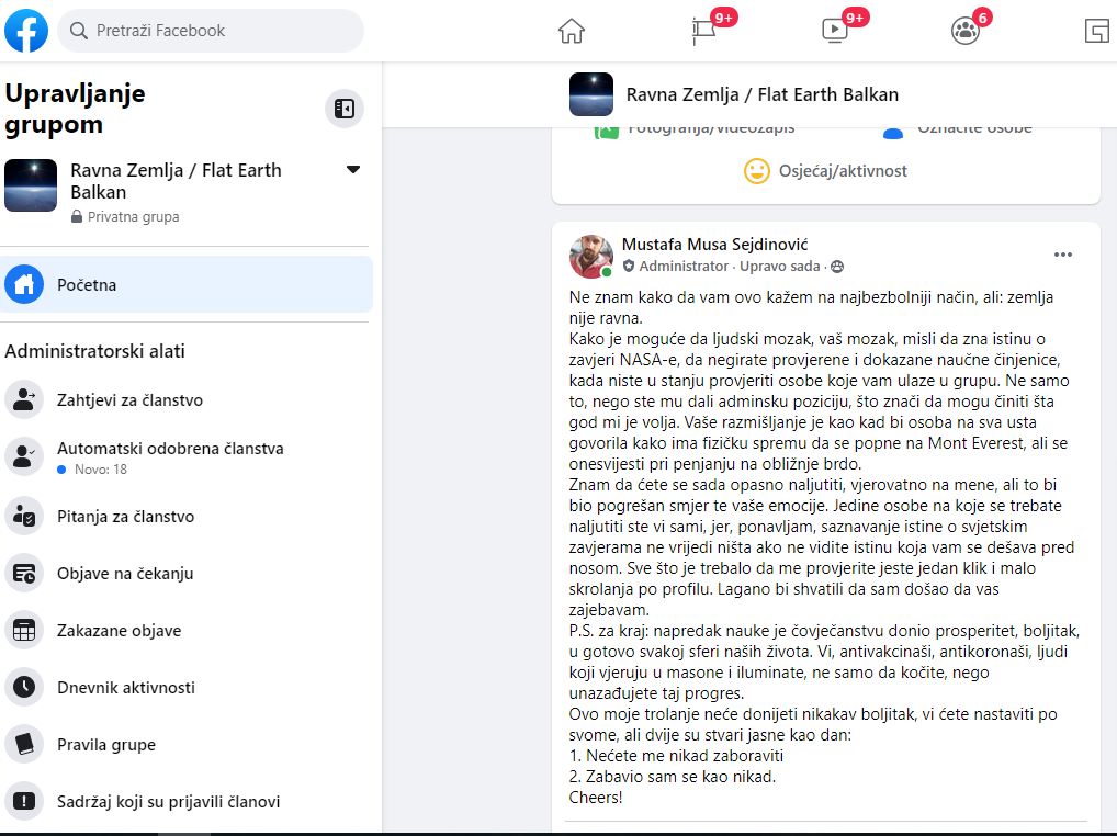 Dakle, jedan čovek je hteo da se zabavi i u tome je uspeo, ali zabavio je i na hiljade korisnika Facebook-a. Pritajio se u FB grupi Ravna Zemlja i čekao svoju priliku. Na njegovu sreću neko u grupi je pitao da li neko hoće admina i on se naravno prijavio. I vidi čuda, niko ne proveri ko je on i dozvole mu da bude administrator.