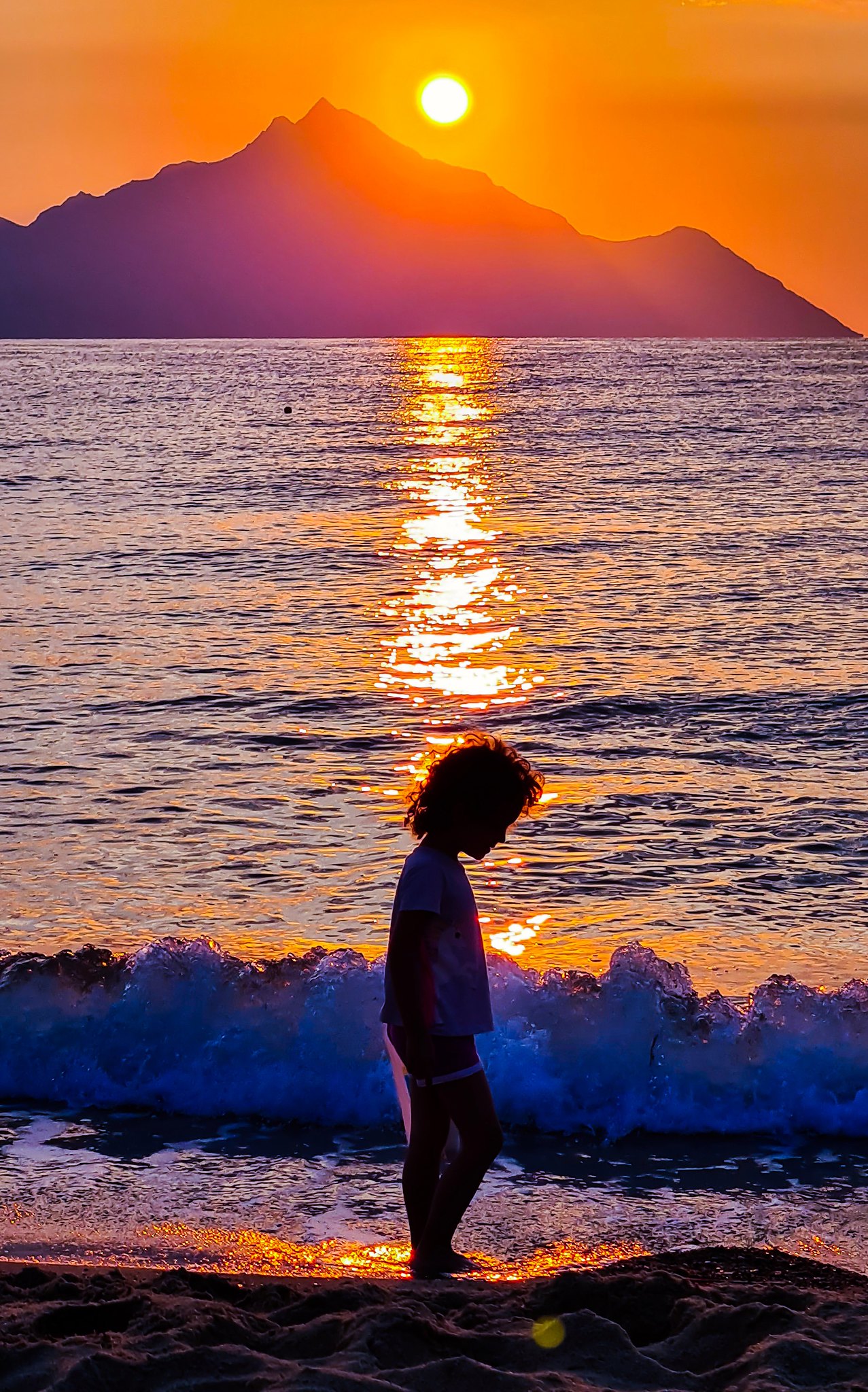 Poslednjeg dana letovanja sam imao sreću da fotografišem duplu dugu iznad Egejskog mora. Ipak, sva njena lepota nije mogla da se prikaže fotografijom. Jedna od omiljenih fotografija je nastala kada je jedan mališan sasvim slučajno prošetao ispred kamere tokom izlaska Sunca.