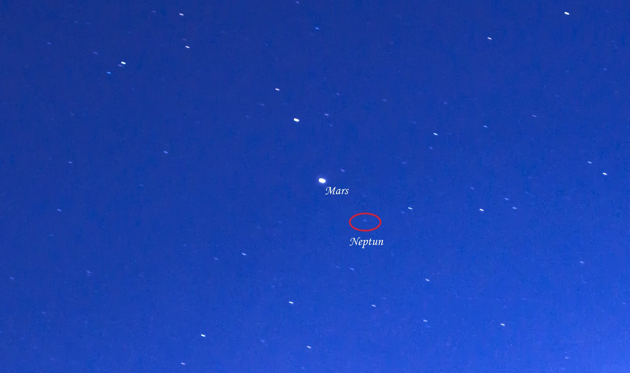Na dan otkrića prividno u blizini Neptuna na nebu se nalazila i planeta Saturn u sazvežđu Vodolija. Neptun se danas ponovo nalazi u istom sazvežđu samo na drugim koordinatama. Ako je verovati Stellariumu tada je imao magnitudu 7,84 a danas 7,82.
