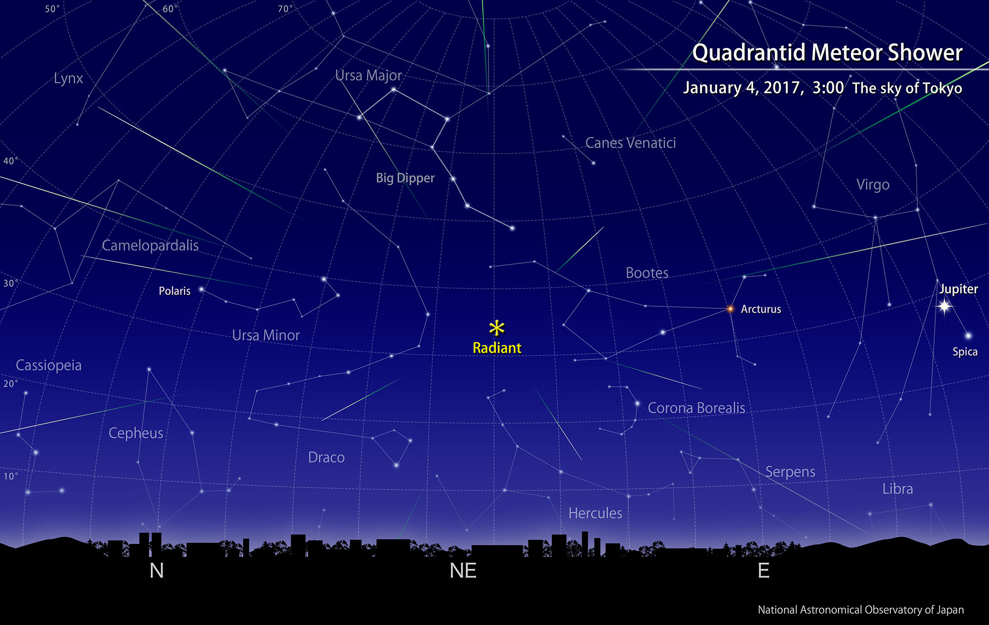 Najveća verovatnoća pojave Kvadrantida je, za razliku od drugih rojeva, nisko na horizontu, baš kao što je prikazano na slici.