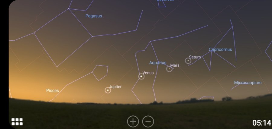 Ako posmatrate istočno jutarnje nebo videćete, počev od horizonta na desno, Jupiter, Veneru, Mars i Saturn. Venera će da magnitudom -4.20 biti najsjajnija, zatim Jupiter (mag. -2,08), Mars (mag. 1) i Saturn (mag. 0.8).