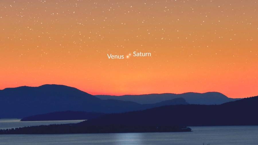 Na slici ispod se jasno vidi da su Zemlja, Venera i Saturn na jednoj liniji i odatle konjunkcija vidljiva sa Zemlje.