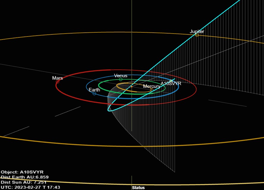 Nova kometa sa službanim nazivom koji se teže pamti – A10SVYR, otkrivena je 22. februara, njen sjaj je sada 18. magnitude, odnosno ne možemo je videti amaterskim teleskopima i udaljena je oko 7,3 AJ i nalazi se u sazvežđu Zmije. Kako se bude približavala Suncu sjaj će joj postepeno rasti i možemo da se nadamo da će dostići sjaj koji su joj prognozirali.