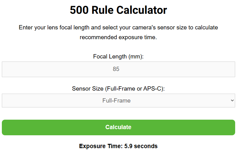 Sledeće što je potrebno uraditi da znate žižnu daljinu objektiva kako bi odabrali pravo vreme ekspozicije. U ovom slučaju se najčešće primenjuje pravilo 500, odnosno kada ovaj broj podelite sa žižnom daljinom objektiva. Na slici ispod je primer koliko vreme izlaganja po fotografiji je potrebno za objektiv od 85 mm a da ne dobijete zvezdane tragove, odnosno da zvezde ostanu tačkaste na fotografiji: