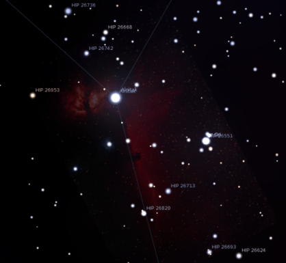 Najlakše je ove magline naći na nebu tako što ćemo prvo naći zvezdu Alnitak u Orionovom pojasu, što je veoma lako. Na slici se vidi maglina Konjska glava ispod zvezde Alnitak, dok se Plamen vidi levo.