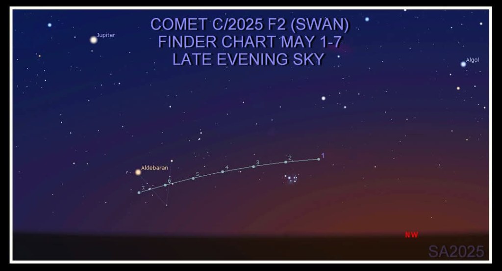 Kometa C/2025 F2 (SWAN) je sada u sazvežđu Pegaz, a 13. aprila će proći pored zvezde Alpheratz (mag. +2), jednu od poznatog četvorougla Pegaza na granici sa Andromedom i koja zapravo pripada sazvežđu Andromeda. Prema ovome zaključuje se da je za posmatranje najpogodnije vreme ujutru pre izlaska Sunca. Oko 4:30 ova zvezda je trenutno oko 10 stepeni iznad severoistočnog horizonta, a Sunce izlazi oko 6:10. Međutim, na posmatranje komete nakon 5:10 Sunce će već imati uticaj.