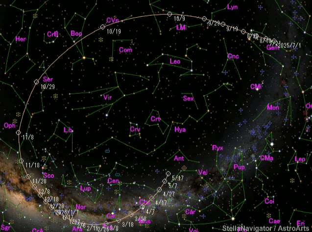 Na slikama ispod se vidi kretanje komete kroz sazvežđa, kao i kretanje magnitude: