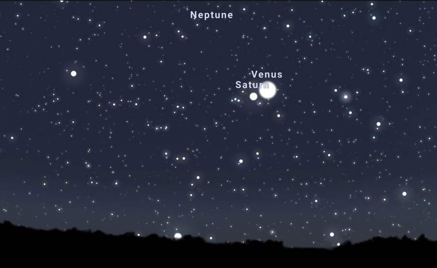 U nedelju 18. januara 2025. godine na zapadnom nebu ćemo imati konjunkciju Saturna i Venere u sazvežđu Vodolija. Planete će biti vidlljive nakon zalaska Sunca, Venera i ranije, dok će se ispod horizonta naći posle 20:22.
